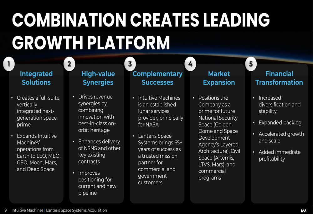 Intuitive Machines highlighted five key benefits from the combination, including integrated solutions, high-value synergies, complementary successes, market expansion, and financial transformation: