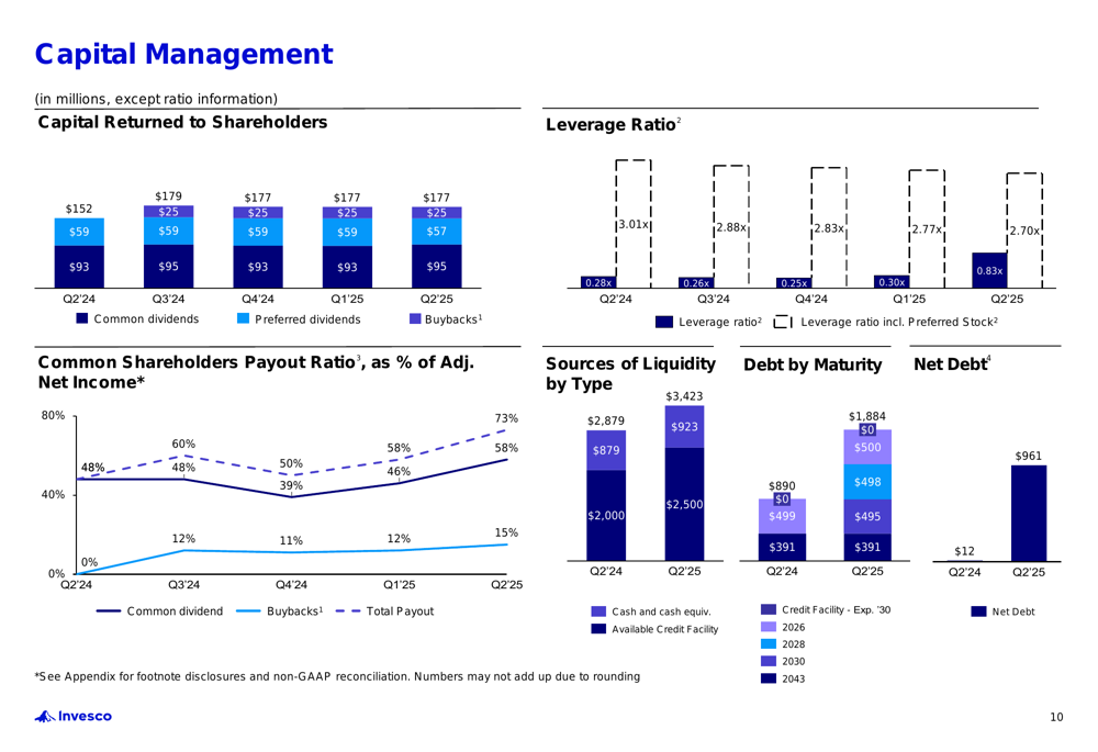 In Q2 2025, Invesco returned $177 million to shareholders, including $95 million in common dividends, $25 million in preferred dividends, and $57 million in share buybacks. The company’s leverage ratio stood at 2.70x, continuing its deleveraging trend. The common shareholders payout ratio was 58% of adjusted net income for the quarter.