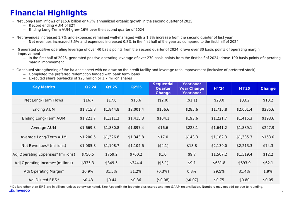 Invesco’s financial results for Q2 2025 show steady improvement in key metrics compared to the previous year: