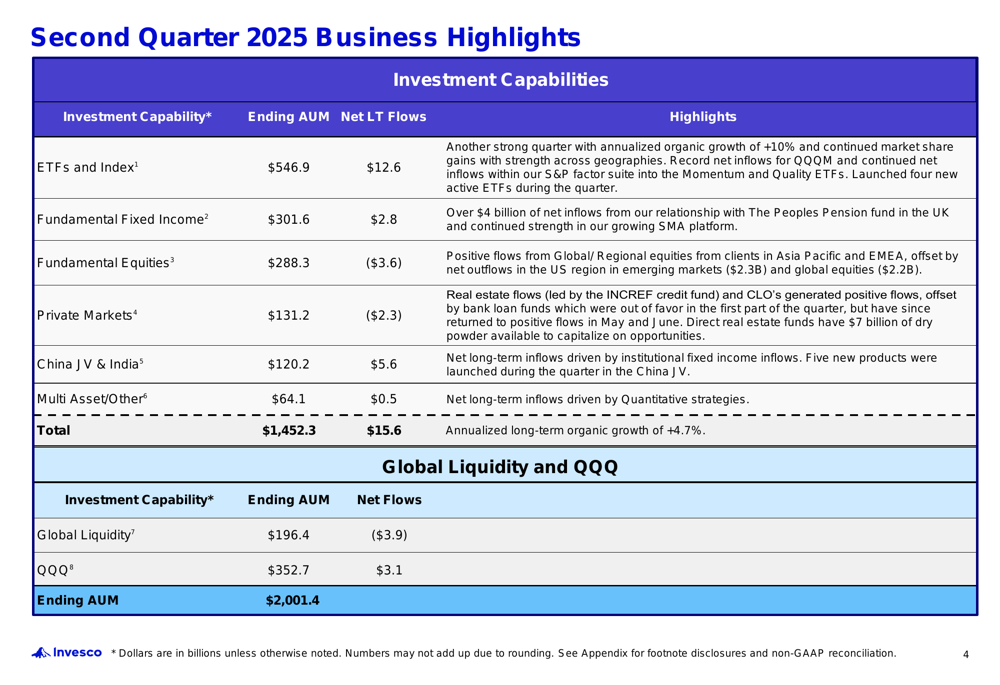 Invesco reported net long-term inflows of $15.6 billion for Q2 2025, slightly down from $17.6 billion in the previous quarter but comparable to the $16.7 billion recorded in Q2 2024. The company’s strategic diversification across geographies and investment capabilities continues to drive growth, with particularly strong performance in ETFs and index strategies.