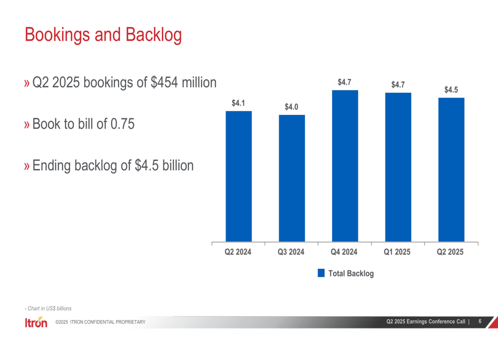 Itron’s backlog remained robust at $4.5 billion, though slightly down from $4.7 billion in the previous quarter. The company reported Q2 2025 bookings of $454 million, resulting in a book-to-bill ratio of 0.75.