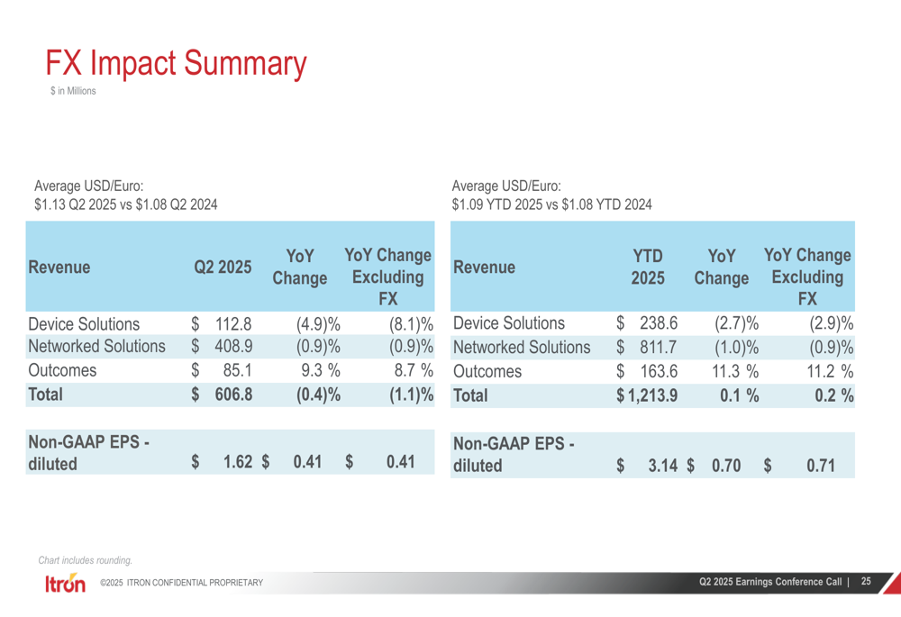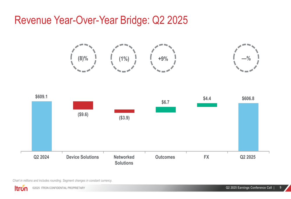 Itron’s performance varied across its three business segments, with the Outcomes segment showing the strongest growth while Device Solutions and Networked Solutions experienced slight revenue declines.