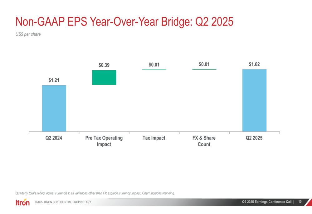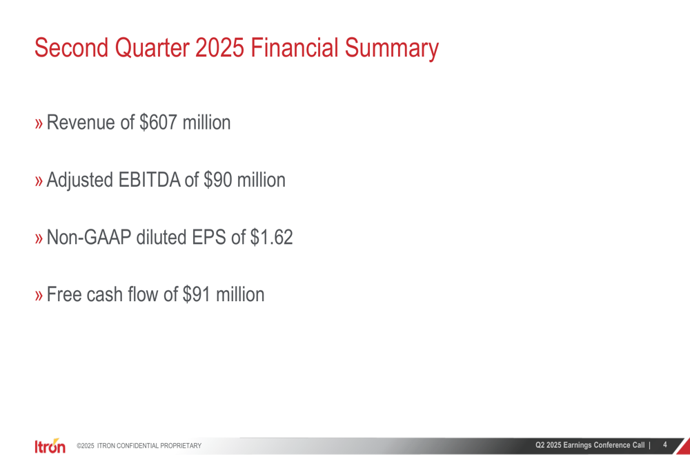 Itron reported Q2 2025 revenue of $606.8 million, slightly down from $609.1 million in the same period last year. However, the company achieved significant improvements in profitability metrics, with gross margin expanding to 36.9% (up 230 basis points year-over-year) and non-GAAP diluted earnings per share reaching $1.62, a 34% increase from $1.21 in Q2 2024.
