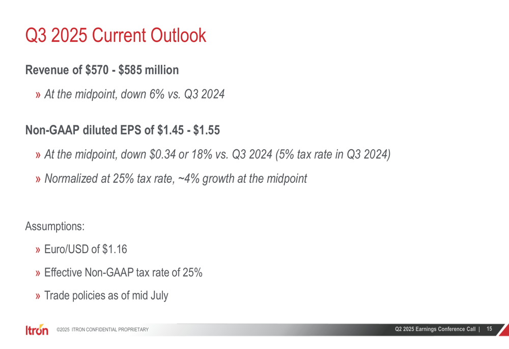Itron provided guidance for Q3 2025 and updated its full-year 2025 outlook. For the third quarter, the company expects revenue of $570-585 million, representing a 6% year-over-year decline at the midpoint. Non-GAAP diluted EPS is projected to be $1.45-1.55.