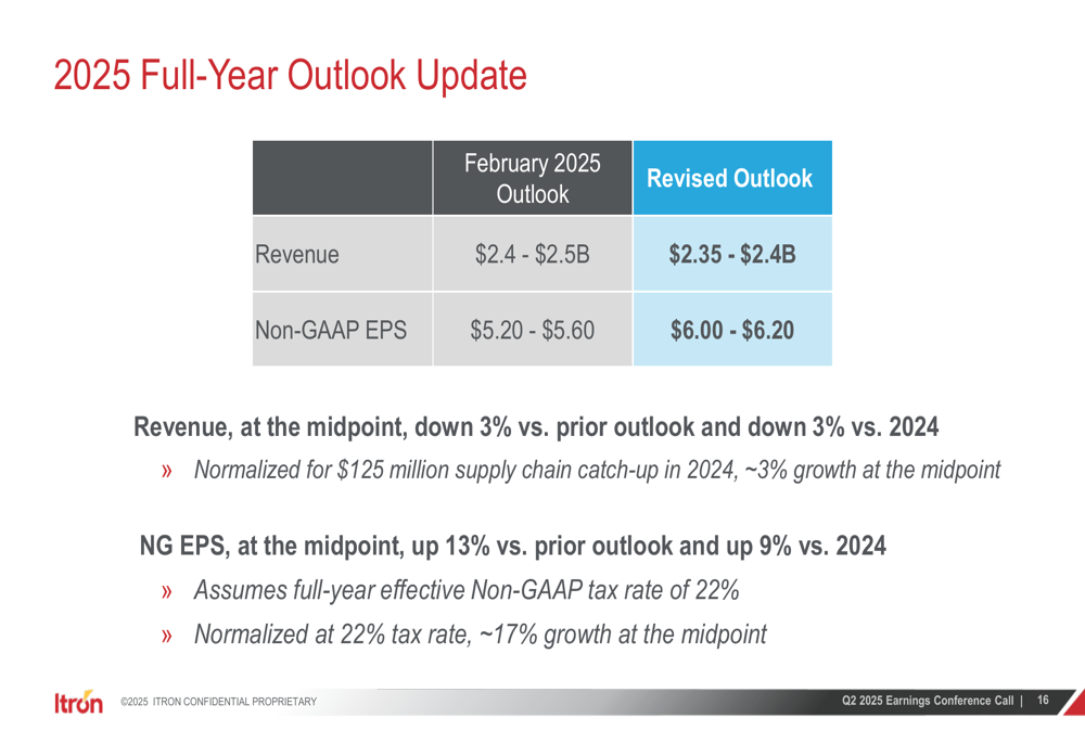 More significantly, Itron revised its full-year 2025 guidance, lowering its revenue expectations while substantially raising its EPS projections. The company now expects full-year revenue of $2.35-2.4 billion, down from its February outlook of $2.4-2.5 billion. However, non-GAAP EPS guidance was increased to $6.00-6.20, up 13% from the previous outlook of $5.20-5.60.