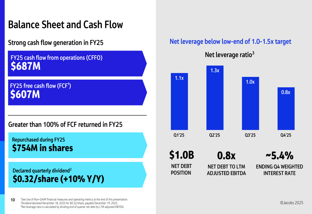 Jacobs demonstrated strong financial discipline throughout fiscal year 2025, generating $687 million in cash flow from operations and $607 million in free cash flow. The company returned more than 100% of free cash flow to shareholders during the year, repurchasing $754 million in shares and declaring a quarterly dividend of $0.32 per share, a 10% increase year-over-year.