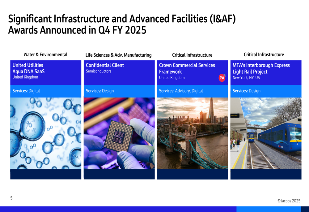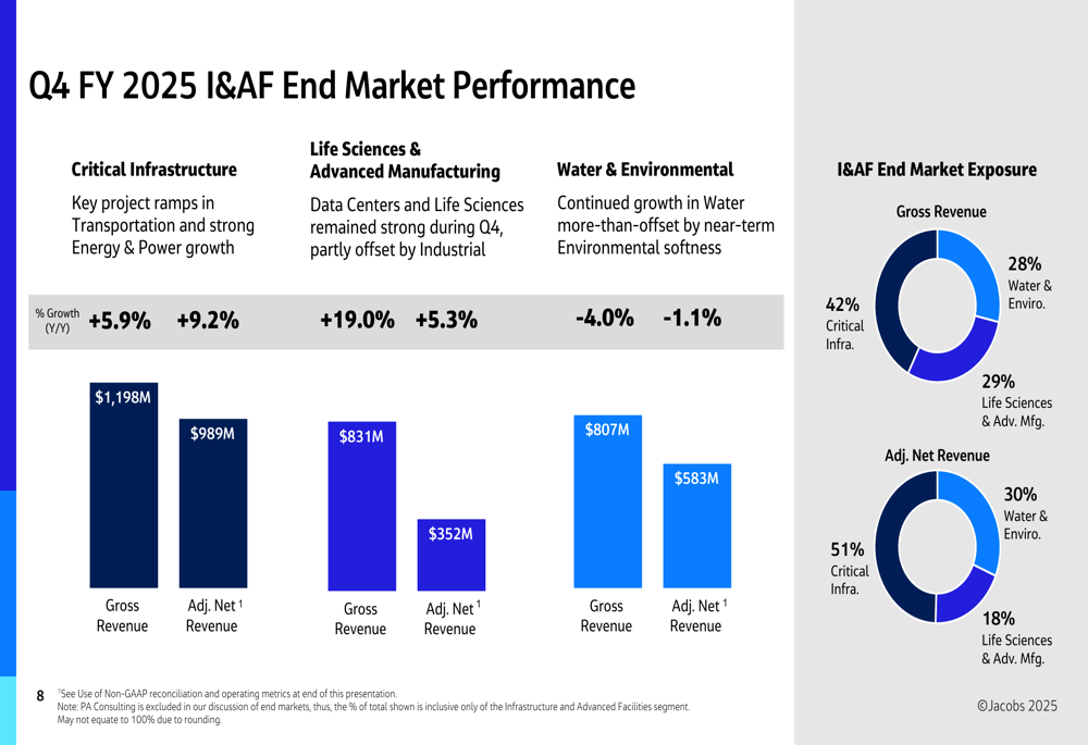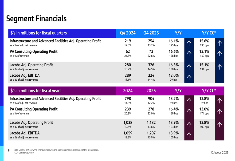 Jacobs' Infrastructure and Advanced Facilities (I&AF) segment showed strong performance in Q4 2025, with adjusted operating profit increasing by 16.1% year-over-year to $254 million. Similarly, PA Consulting delivered robust results with operating profit growing 16.6% to $72 million.