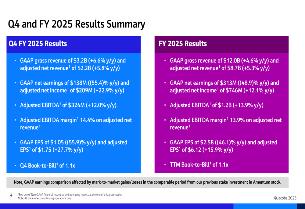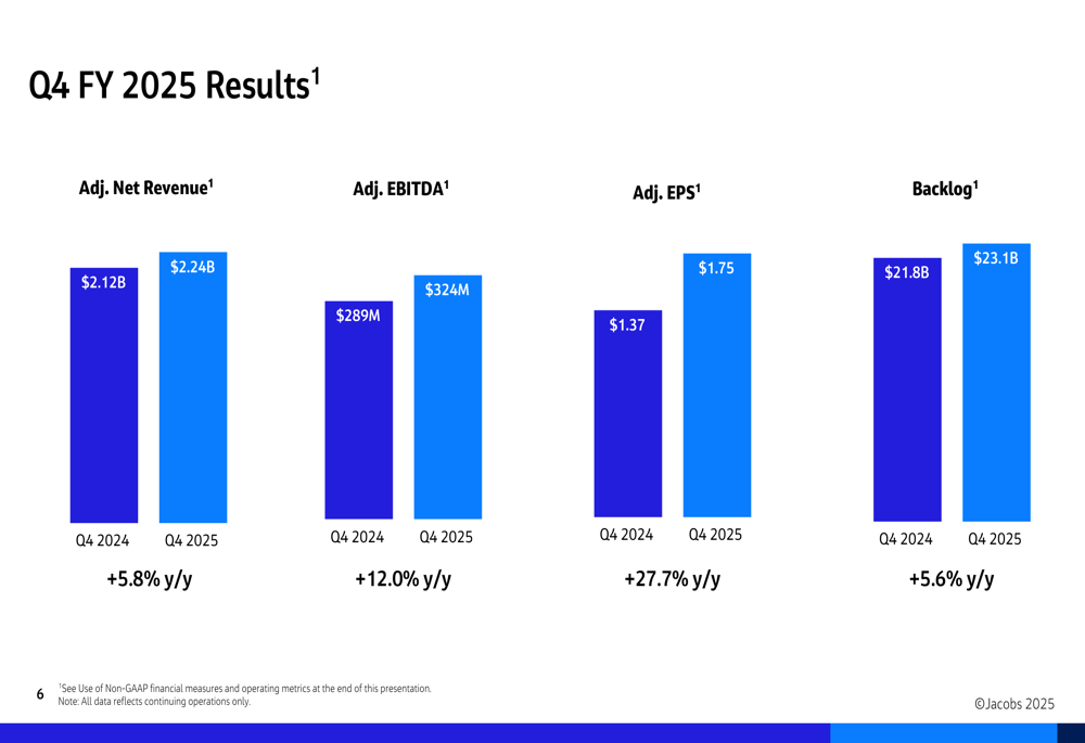 Jacobs reported GAAP gross revenue of $3.2 billion for Q4 2025, a 6.6% increase year-over-year, while adjusted net revenue grew 5.8% to $2.2 billion. The company achieved an adjusted EBITDA of $324 million, up 12.0% compared to the same period last year, with an adjusted EBITDA margin of 14.4% - a record quarterly figure.