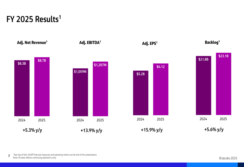 For the full fiscal year 2025, Jacobs delivered adjusted net revenue of $8.7 billion, a 5.3% increase from FY 2024, while adjusted EBITDA grew by 13.9% to $1.2 billion. The company's adjusted EPS for the full year reached $6.12, up 15.9% year-over-year.