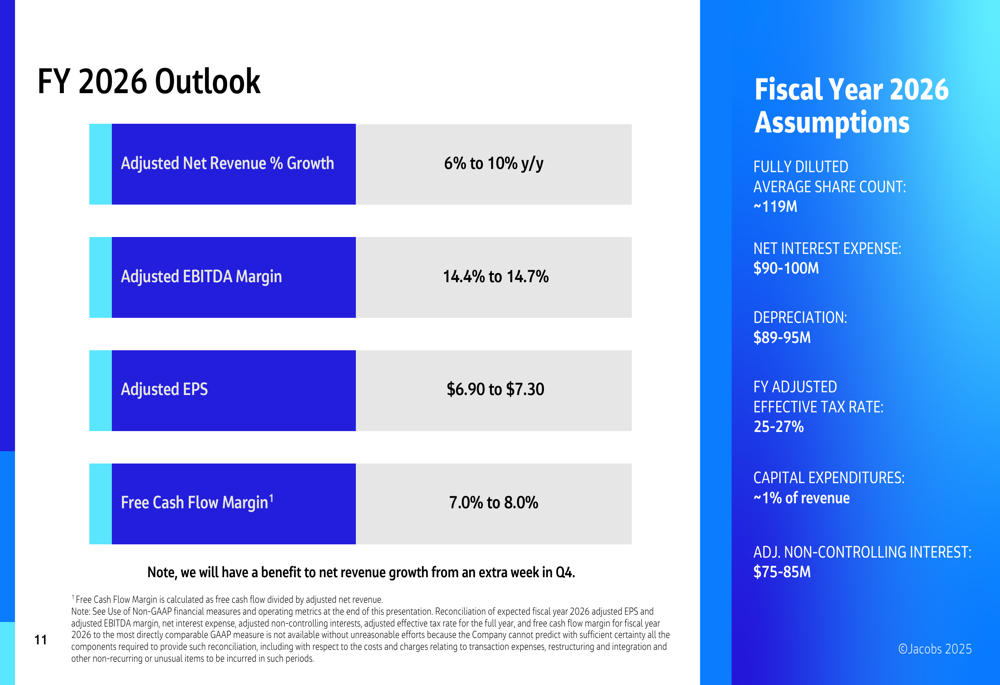 Looking ahead to fiscal year 2026, Jacobs provided a positive outlook, projecting adjusted net revenue growth of 6% to 10% year-over-year and adjusted EBITDA margin between 14.4% and 14.7%. The company expects adjusted EPS to range from $6.90 to $7.30, representing approximately 16% growth at the midpoint compared to FY 2025.