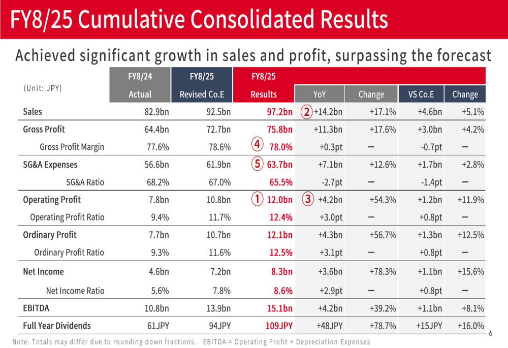 The company’s FY8/25 consolidated results show impressive growth across all key financial metrics. Gross profit increased by 17.6% to 75.8 billion yen, with the gross profit margin improving from 77.6% to 78.0%. Despite a 12.6% increase in SG&A expenses to 63.7 billion yen, the SG&A ratio decreased from 68.2% to 65.5%, contributing to the substantial improvement in operating profit.