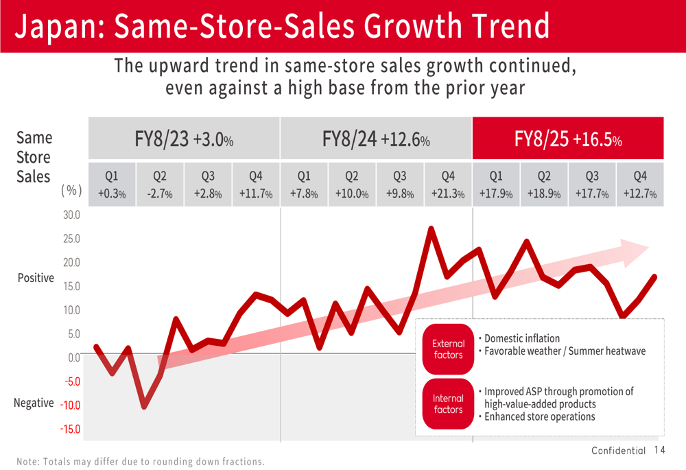 The strong performance was driven by sustained high same-store sales growth of 16.5% in Japan, coupled with improved profitability in overseas operations, particularly in Taiwan and China. The company also expanded its global footprint, increasing its total store count from 736 to 789 locations.