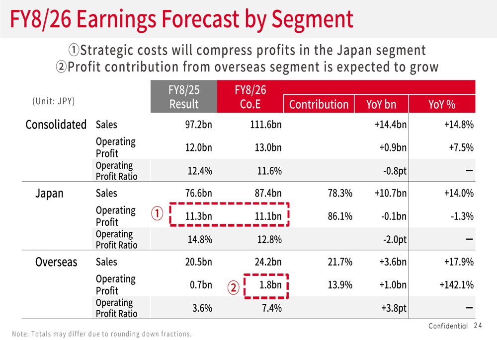 The following chart shows the earnings forecast by segment for FY8/26, highlighting the expected growth in overseas profit contribution: