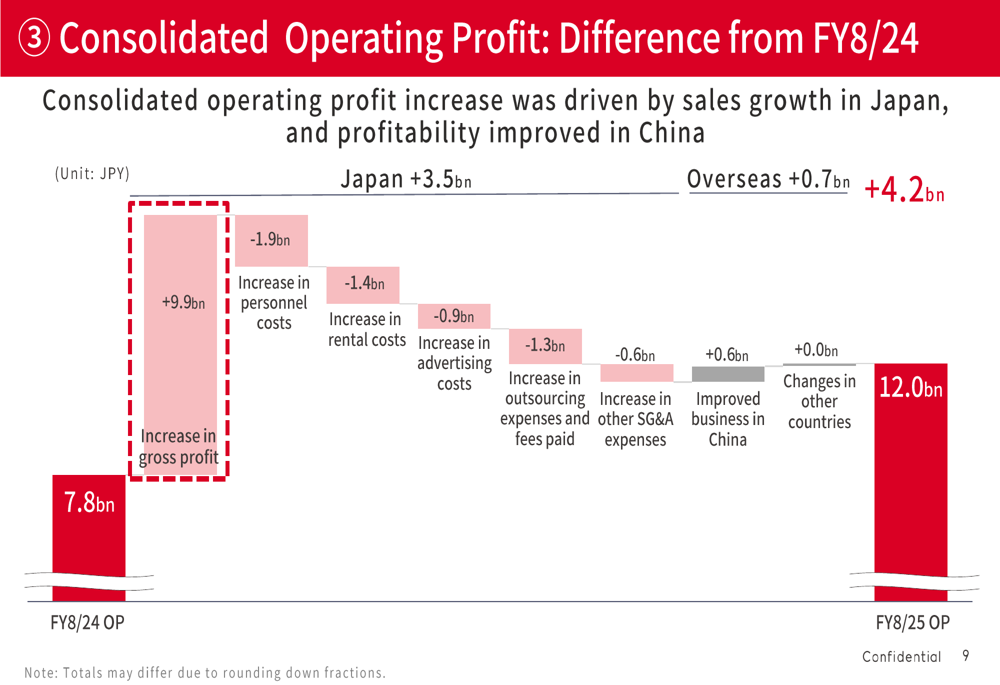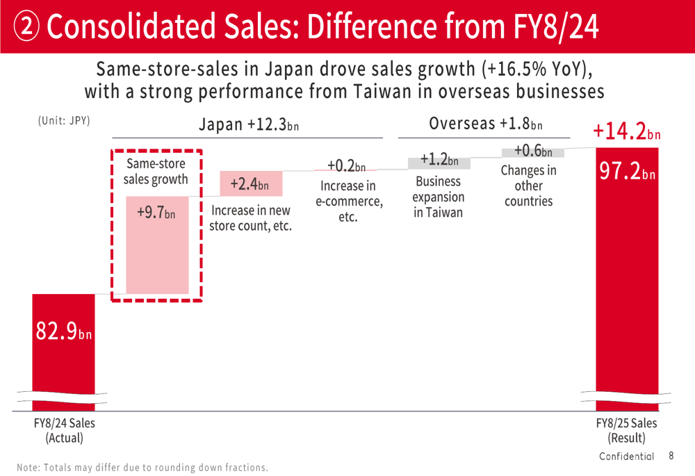Breaking down the sales growth of 14.2 billion yen compared to FY8/24, the largest contributor was same-store sales growth in Japan (+9.7 billion yen), followed by new store openings (+2.4 billion yen) and business expansion in Taiwan (+1.2 billion yen):