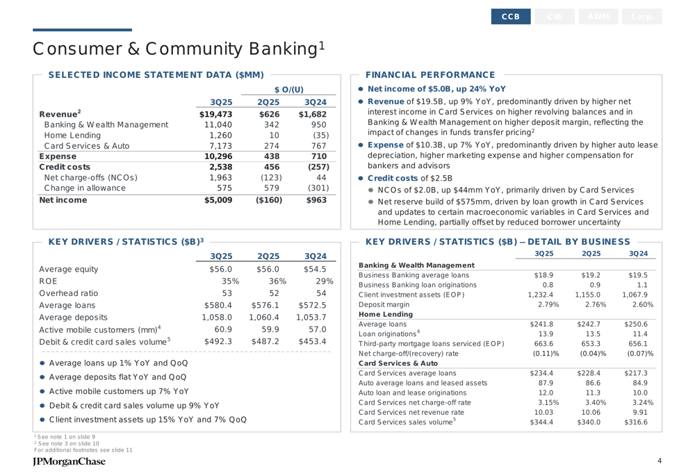 The Consumer & Community Banking segment delivered exceptional results, with net income of $5.0 billion, up 24% year-over-year. Revenue increased by 9% to $19.5 billion, driven by strong performance across banking, wealth management, home lending, and card services. The segment maintained a return on equity of 35% and an overhead ratio of 53%.
