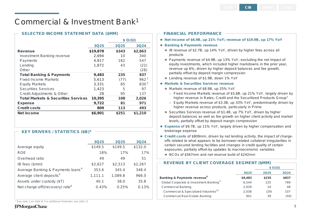 The Commercial & Investment Bank segment reported net income of $6.9 billion, a 21% increase compared to Q3 2024. Revenue rose by 17% year-over-year to $19.9 billion, demonstrating strong performance across banking, payments, and markets activities.
