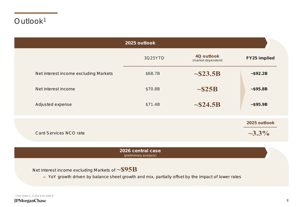 JPMorgan provided an optimistic outlook for the remainder of 2025 and preliminary guidance for 2026. For 2025, the bank expects net interest income excluding Markets to reach approximately $92.2 billion, with total net interest income of around $95.8 billion. Adjusted expenses are projected at approximately $95.9 billion, and the Card Services net charge-off rate is expected to be around 3.3%.