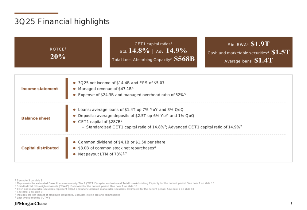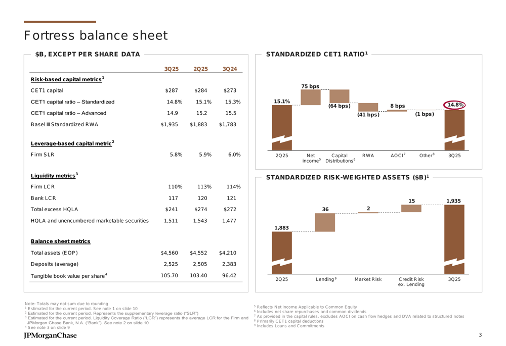 As shown in the following financial highlights slide, JPMorgan maintained strong capital and liquidity positions while delivering solid returns: