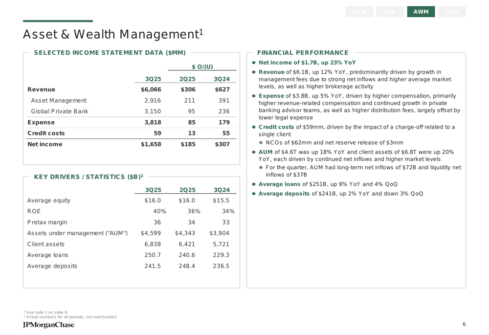 The Asset & Wealth Management segment continued its strong trajectory with net income of $1.7 billion, up 23% year-over-year. Revenue increased by 12% to $6.1 billion, driven by growth in assets under management and client relationships.