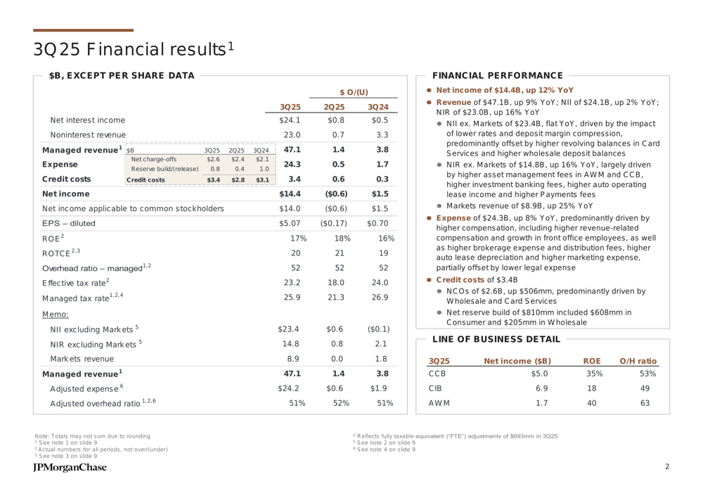 JPMorgan reported managed revenue of $47.1 billion for Q3 2025, marking a 9% increase compared to the same period last year. The company’s expenses rose by 8% year-over-year to $24.3 billion, resulting in a managed overhead ratio of 52%. Credit costs for the quarter stood at $3.4 billion.