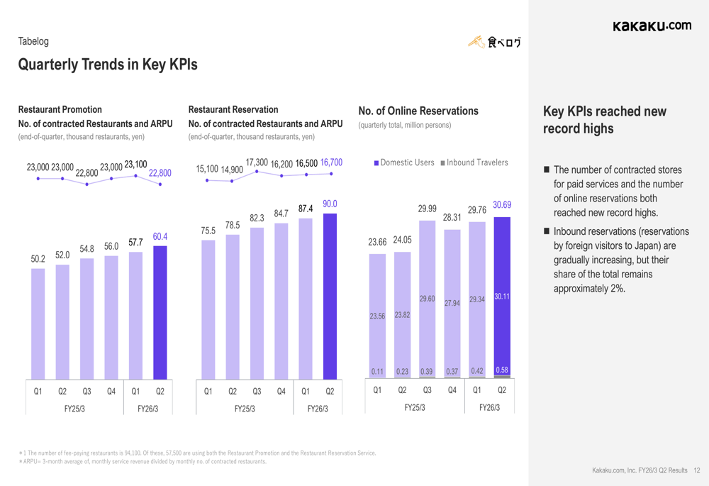 Tabelog’s key performance indicators showed positive momentum, with the number of contracted restaurants reaching a new record high of 23,100. Online reservations also continued to grow, with inbound reservations from foreign visitors increasing, though they still represent only approximately 2% of total reservations.