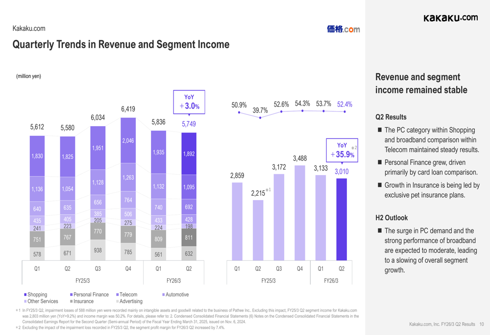 The core Kakaku.com price comparison segment showed modest revenue growth of 3.0% year-over-year, reaching ¥5,749 million in Q2. However, segment income increased significantly by 35.9% to ¥3,010 million, demonstrating improved operational efficiency. The personal finance category was particularly strong, showing 35.9% year-over-year growth.