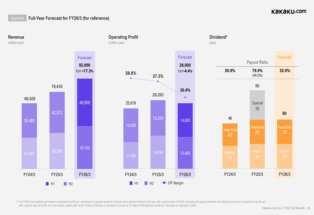 KakakuCom maintained its full-year forecast for FY26/3, projecting revenue of ¥92 billion (+17.3% YoY) and operating profit of ¥28 billion (-4.4% YoY). The forecast is broken down by quarter as shown in the following slide:
