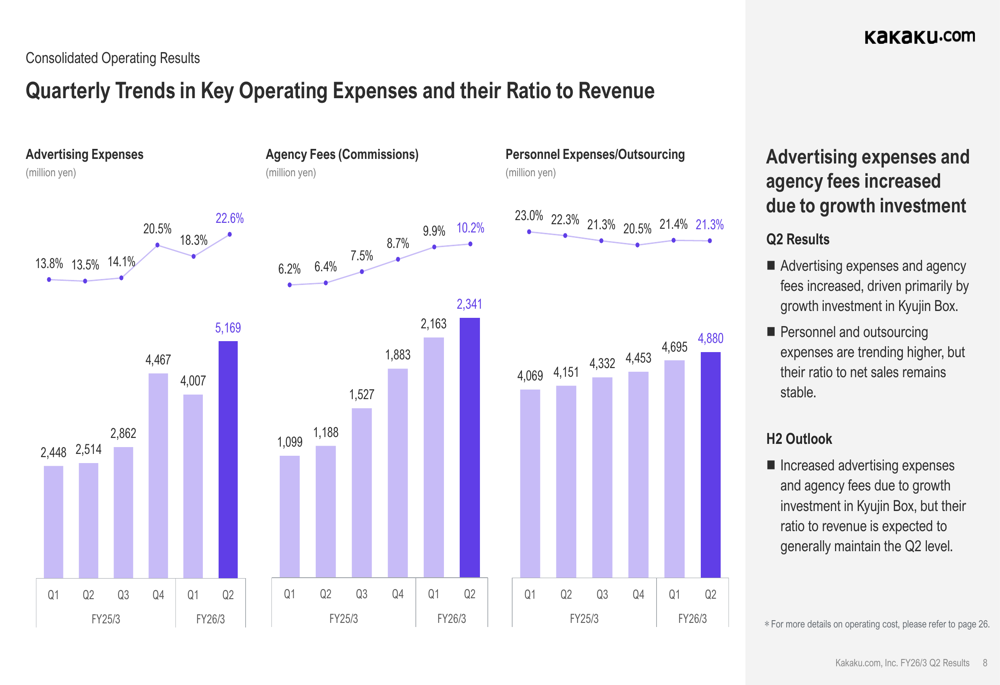 The company’s operating expenses reflect its growth strategy, with advertising expenses increasing to 22.6% of revenue in Q2 FY26/3 and personnel expenses reaching 21.3% of revenue. These investments are primarily directed toward the Kyujin Box segment and are expected to generate future returns.