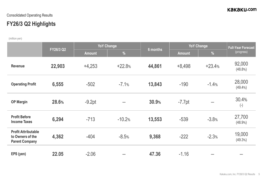 The company reported Q2 FY26/3 revenue of ¥22,903 million, representing a 22.8% year-over-year increase, while operating profit declined 7.1% to ¥6,555 million. The operating profit margin contracted to 28.6%, reflecting KakakuCom’s strategic decision to invest heavily in growth initiatives, particularly in its Kyujin Box segment.