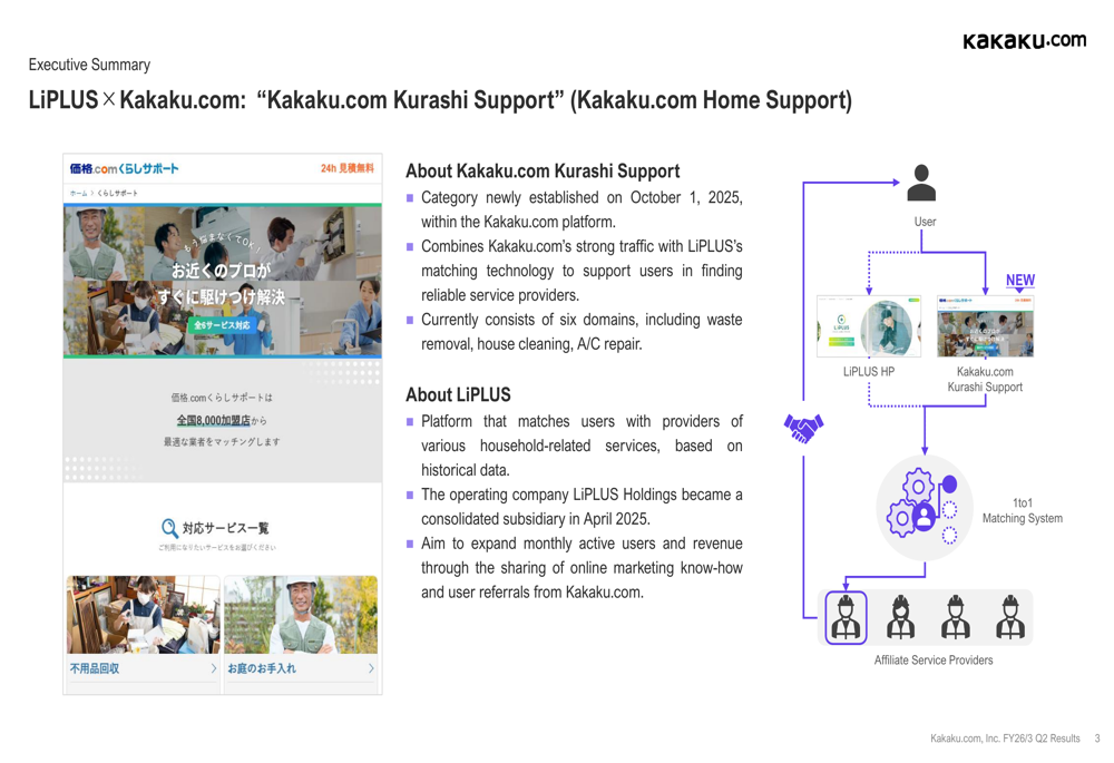 A key strategic development announced during the presentation was the integration of LiPLUS with Kakaku.com’s newly established "Kurashi Support" (Home Support) service, which launched on October 1, 2025. This integration combines Kakaku.com’s substantial user traffic with LiPLUS’s matching technology to connect users with service providers across six domains, including waste removal, house cleaning, and air conditioning repair.