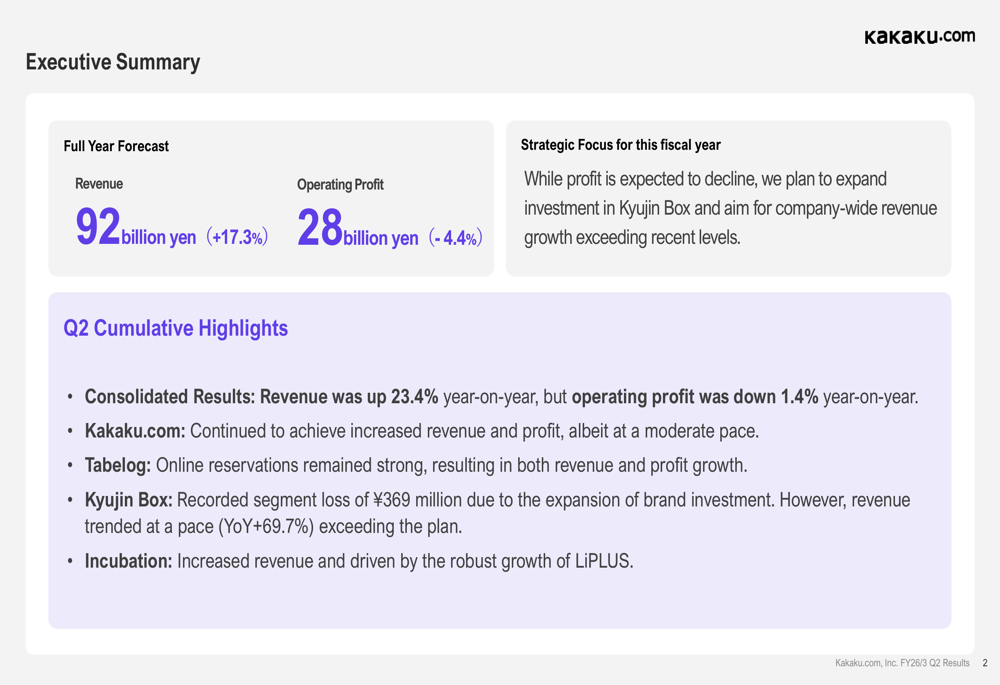 In conclusion, KakakuCom’s Q2 FY26/3 presentation reveals a company focused on long-term growth through strategic investments, particularly in its high-potential Kyujin Box segment. While these investments are currently impacting profitability, the strong revenue growth across segments and ambitious mid-term targets indicate management’s confidence in the company’s strategic direction.