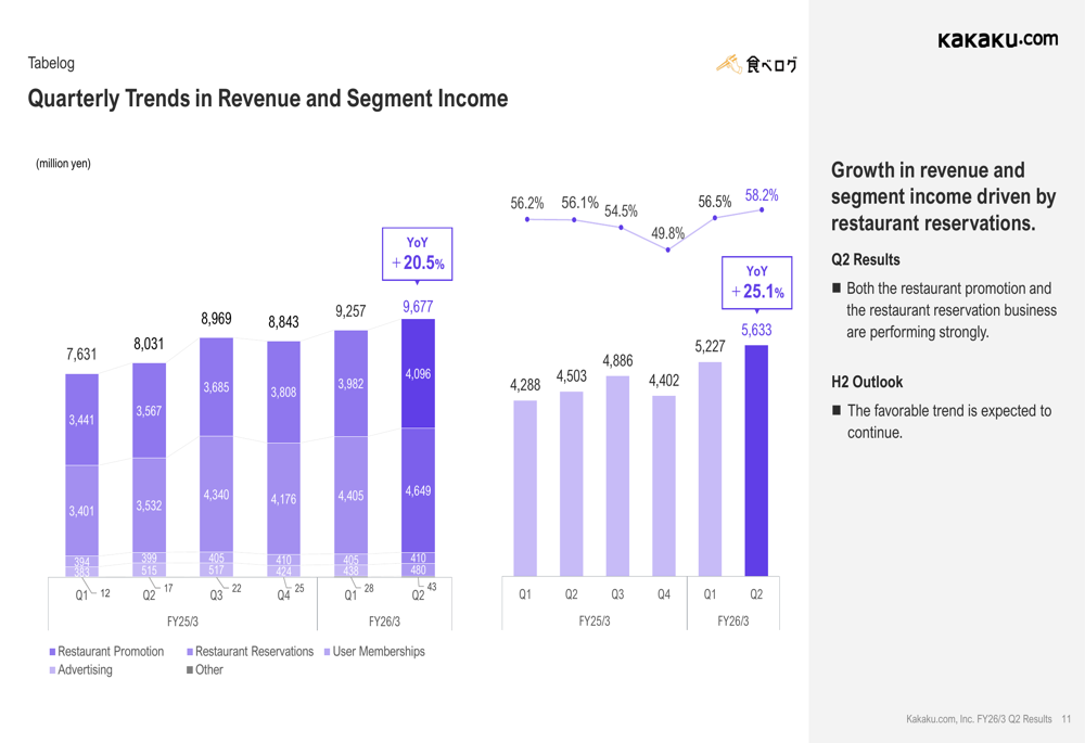 The Tabelog restaurant platform continued its strong performance with revenue increasing 20.5% year-over-year to ¥9,677 million, while segment income grew 25.1% to ¥5,633 million. This growth was primarily driven by the restaurant reservations business, which saw a 25.1% increase compared to the previous year.