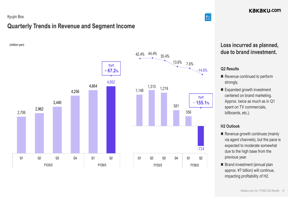 The Kyujin Box job recruitment platform demonstrated the strongest revenue growth among all segments, increasing 67.2% year-over-year to ¥4,952 million. However, the segment reported an operating loss of ¥724 million due to significant brand investment, which the company described as planned and necessary for future growth.
