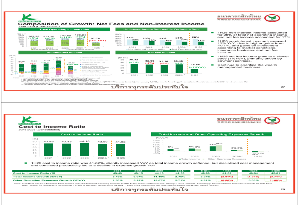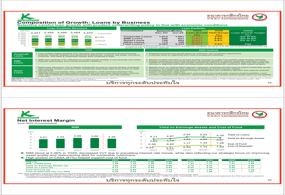 KASIKORNBANK’s 2Q25 presentation demonstrates the bank’s resilience and strategic focus on quality over quantity in a challenging economic environment. While growth targets have been impacted by macroeconomic headwinds, the bank has maintained stable asset quality, strong capital position, and cost discipline.