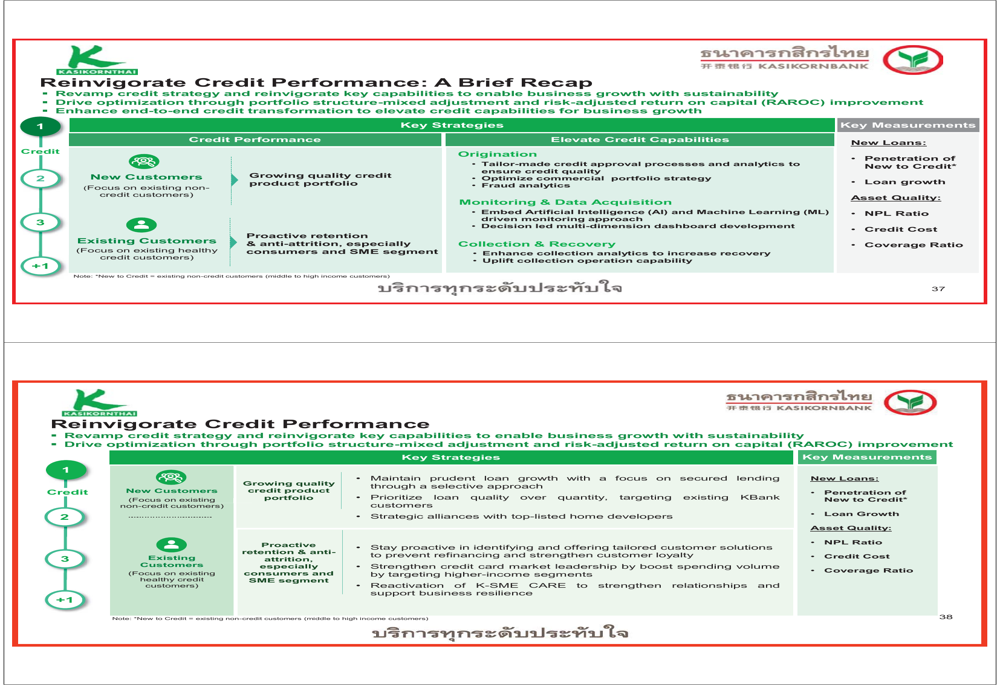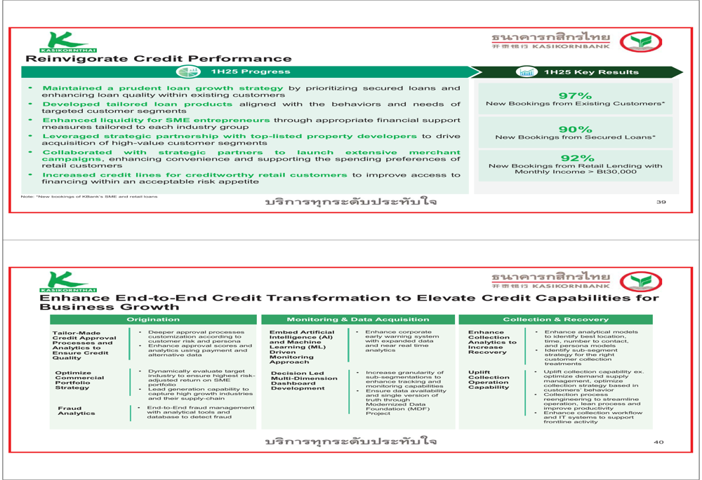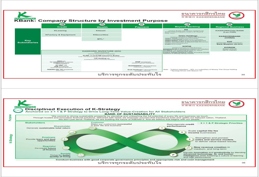 KASIKORNBANK continues to execute its "K-Strategy" focused on navigating volatility while driving sustainable returns. The strategy emphasizes disciplined growth through reinvigorating credit performance, scaling capital-light fee income, strengthening sales and service models, creating new revenue streams, and enhancing productivity.