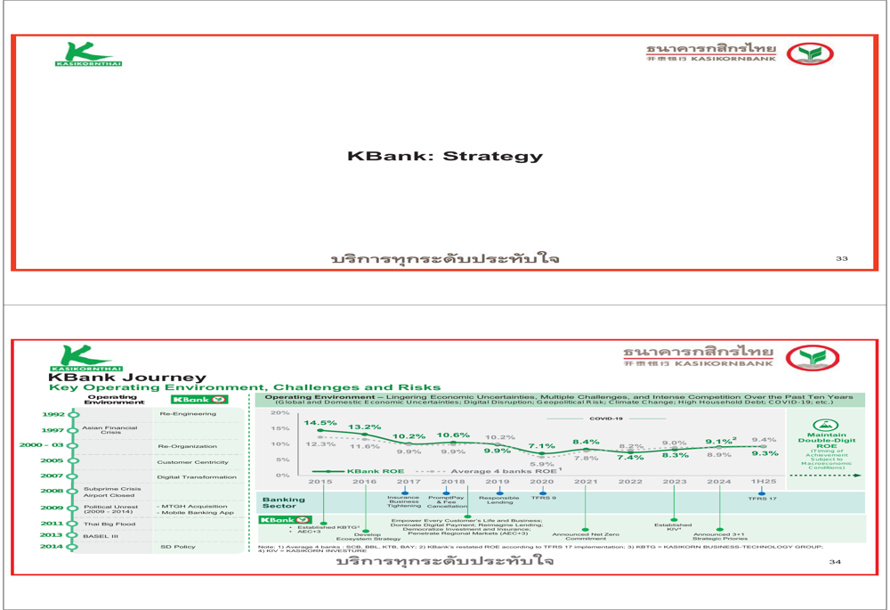 Despite these challenges, KASIKORNBANK maintains its double-digit ROE target, though it acknowledges that the timing is dependent on macroeconomic conditions. The bank’s priorities remain unchanged: maintaining capital buffer strength with a CET1 target of ≥15%, delivering sustainable total shareholder returns with a dividend payout of ≥50%, and disciplined execution of its strategic initiatives.