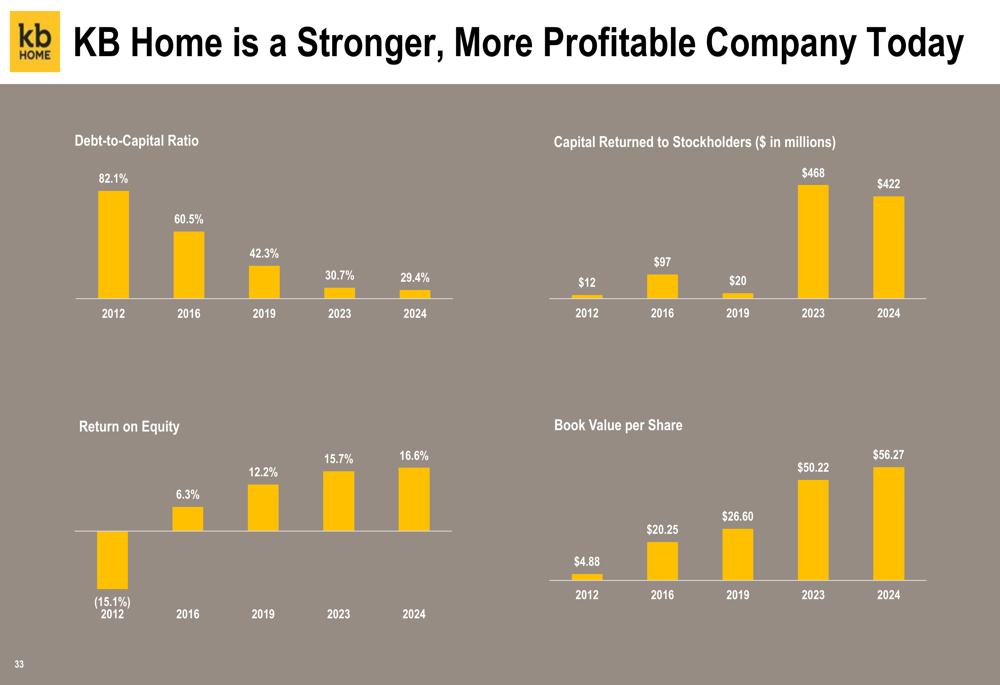 Additional financial metrics showing KB Home’s strengthened position include a reduction in debt-to-capital ratio from 82.1% in 2012 to 29.4% in 2024 (though this increased slightly to 33.2% in Q3 2025), and growth in book value per share from $4.88 in 2012 to $56.27 in 2024: