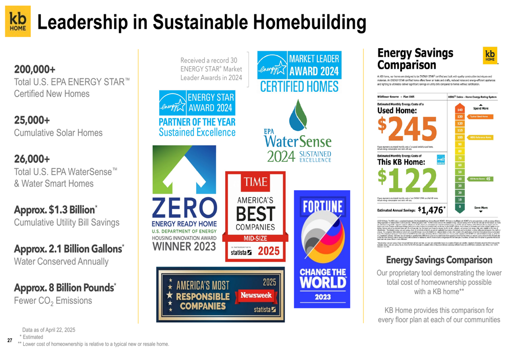 KB Home continues to position itself as a leader in sustainable homebuilding, highlighting achievements including over 200,000 ENERGY STAR certified homes, more than 25,000 solar homes, and approximately $1.3 billion in cumulative utility bill savings for homeowners.