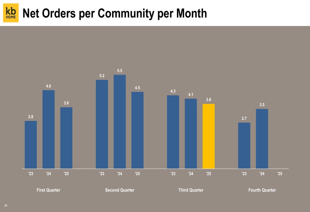 Despite these challenges, KB Home maintained a healthy absorption rate of 3.8 homes per community per month, though this represented a 7% decrease from the previous year: