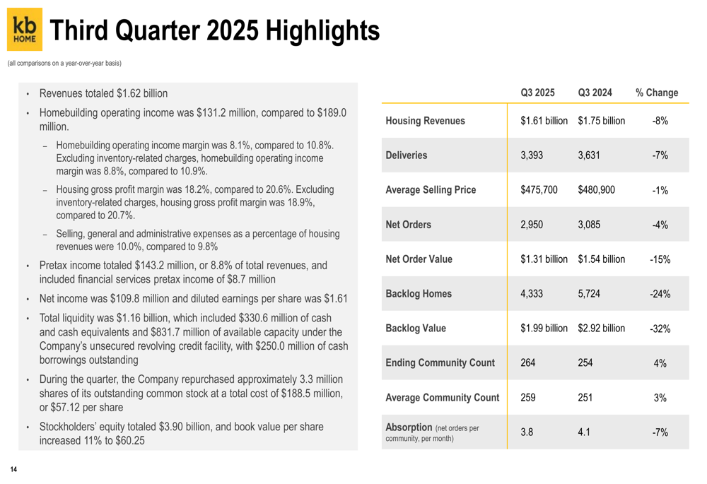 KB Home’s third quarter 2025 results showed declines across most key metrics compared to the same period in 2024. Housing revenues fell 8% year-over-year to $1.61 billion, while home deliveries decreased 7% to 3,393 units. The average selling price saw a modest 1% decline to $475,700.