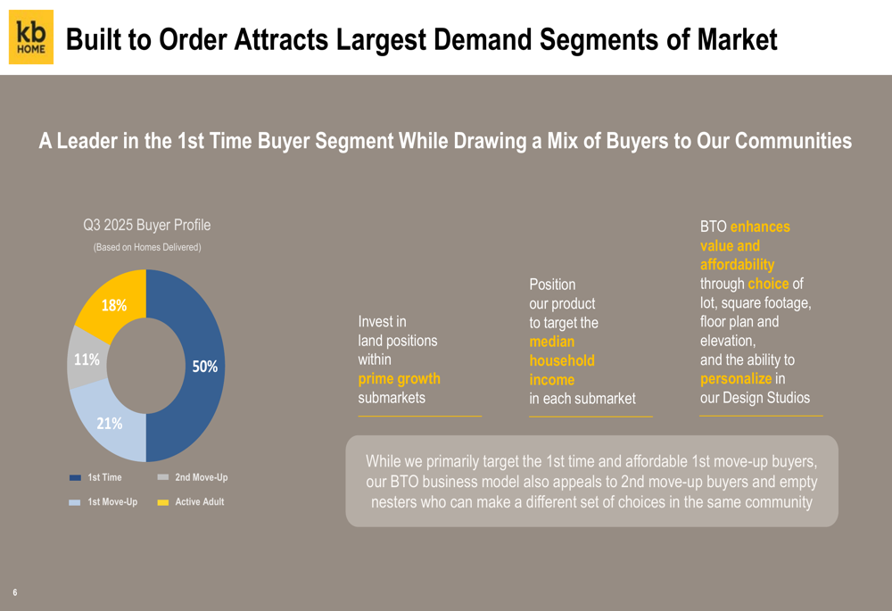 KB Home continues to emphasize its Built-to-Order (BTO) model as a key differentiator in the market. This approach allows homebuyers to personalize their homes, which the company believes provides a competitive advantage. The presentation highlighted that the BTO model attracts a diverse range of buyers, with first-time homebuyers representing 50% of deliveries in Q3 2025, followed by first move-up (18%), active adult (21%), and second move-up (11%) segments.