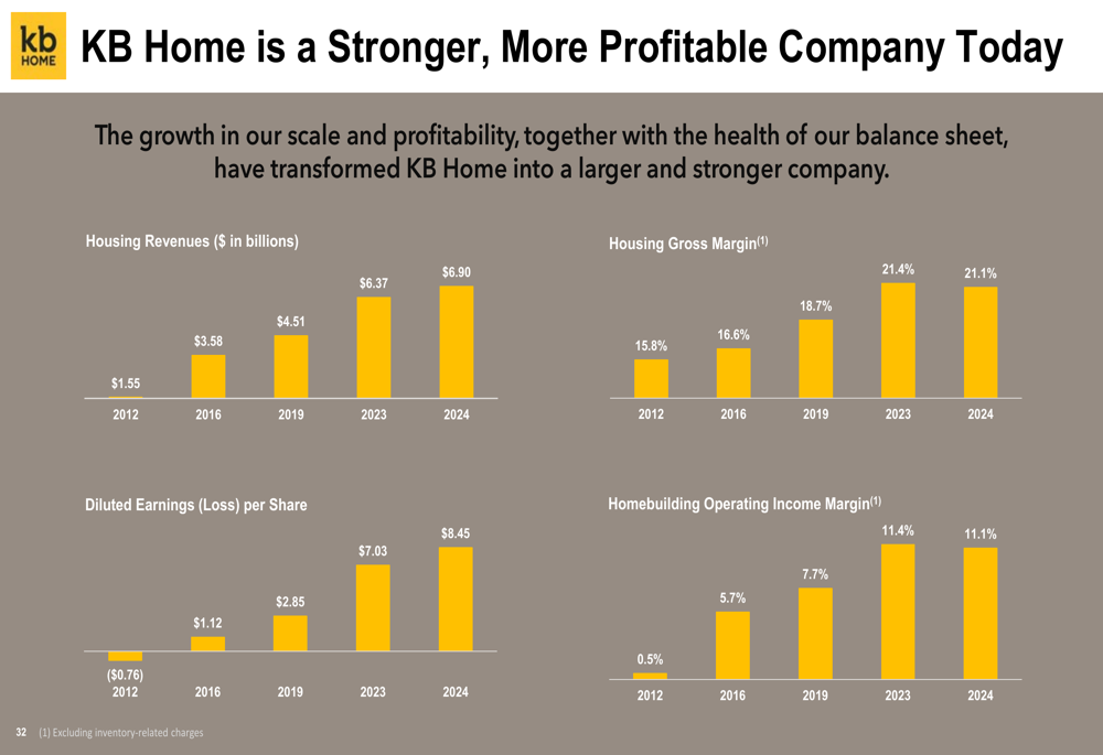 The presentation emphasized KB Home’s transformation over time into a stronger, more profitable company. Key metrics showing this evolution include growth in diluted earnings per share from $0.76 in 2012 to $8.45 in 2024, and improvement in homebuilding operating income margin from 0.5% in 2012 to 11.1% in 2024.