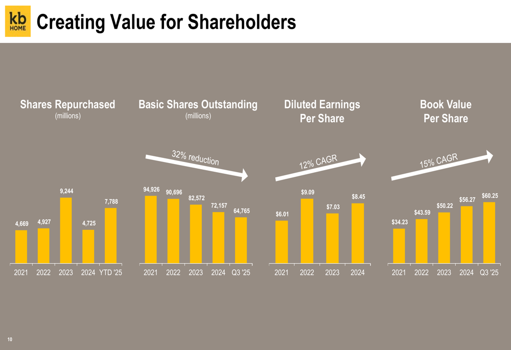 A key component of KB Home’s capital allocation strategy has been returning value to shareholders through share repurchases and dividends. Since Q2 2021, the company has returned over $1.8 billion to stockholders, with significant share repurchase activity reducing the basic shares outstanding from 94.9 million in 2021 to 64.8 million in Q3 2025, a 32% reduction.