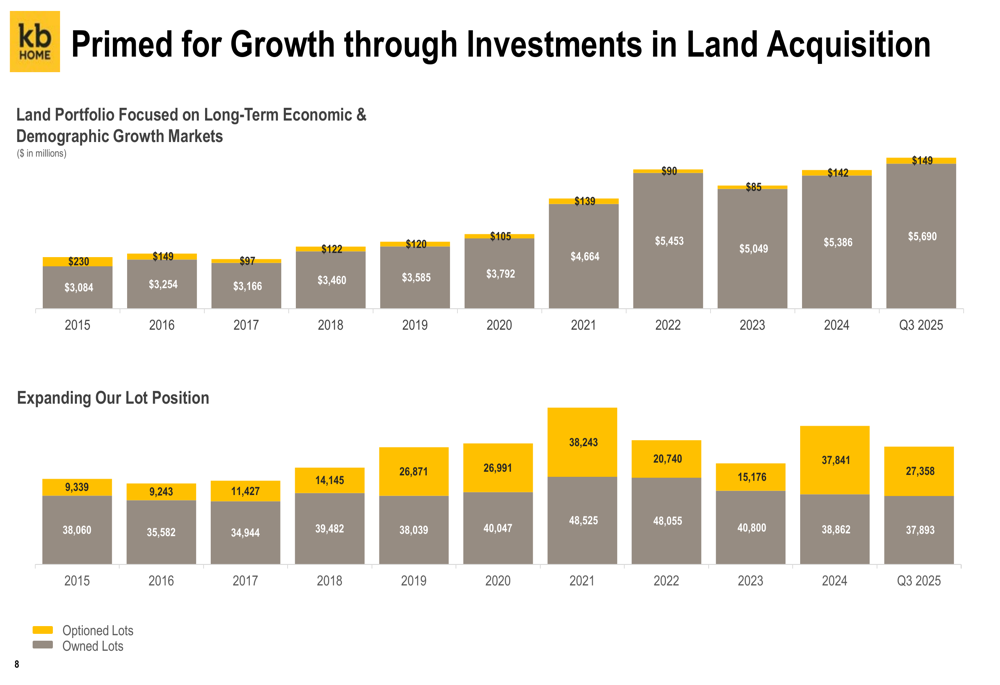 KB Home has maintained its focus on land acquisition and community count growth as part of its long-term strategy. The company reported a 4% year-over-year increase in ending community count to 264, and a 3% increase in average community count to 259 for Q3 2025. This investment in land positions is intended to support future growth, as shown in the following chart tracking the company’s owned and optioned lots: