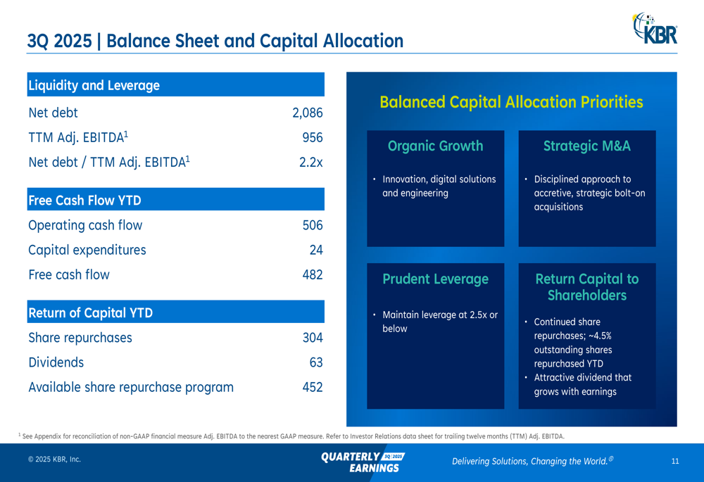 The company returned significant capital to shareholders, with $304 million in share repurchases and $63 million in dividends year-to-date. KBR still has $452 million available under its share repurchase program, demonstrating its commitment to shareholder returns while maintaining balanced capital allocation priorities including organic growth, strategic M&A, and prudent leverage.