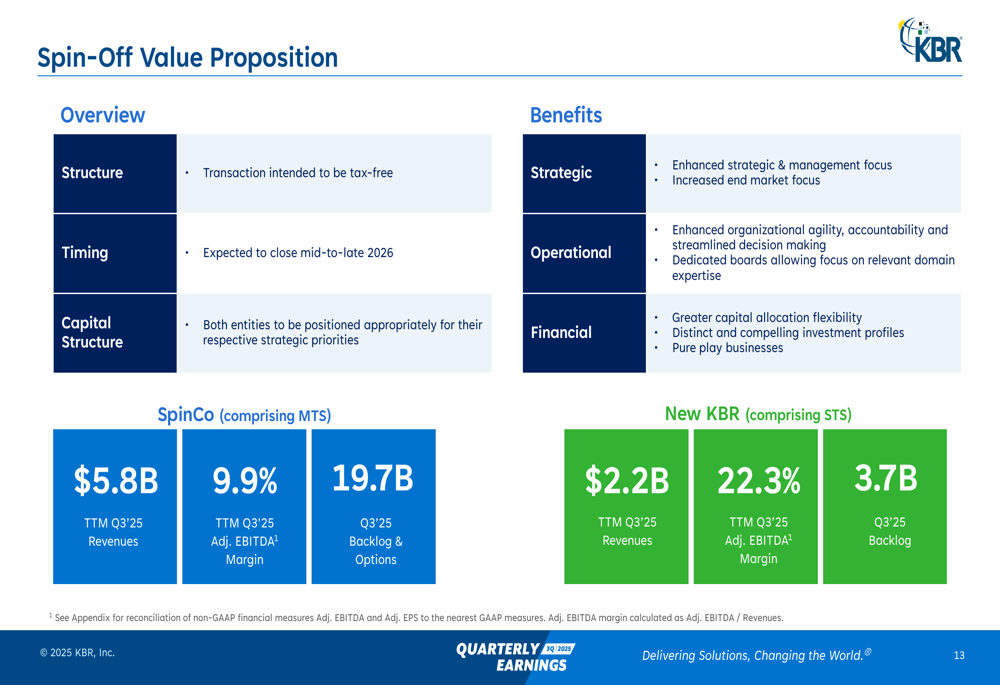 A significant focus of the presentation was KBR’s planned spin-off of its Mission Technologies segment, which is expected to create two focused public companies by mid-to-late 2026. The tax-free spin-off will result in SpinCo (comprising Mission Tech Services) with TTM Q3’25 revenues of $5.8 billion and an adjusted EBITDA margin of 9.9%, and New KBR (comprising Sustainable Tech Solutions) with TTM Q3’25 revenues of $2.2 billion and a significantly higher adjusted EBITDA margin of 22.3%.