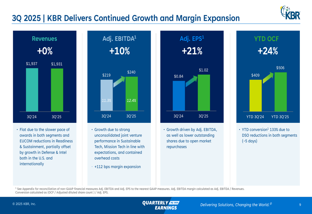 KBR’s third-quarter results demonstrated resilience in profitability metrics despite revenue challenges. The company reported flat year-over-year revenue of $1.9 billion but delivered impressive growth in adjusted EBITDA, which increased 10% to $240 million. Adjusted EBITDA margin expanded to 12.4%, representing a 112 basis point improvement compared to the same period last year.