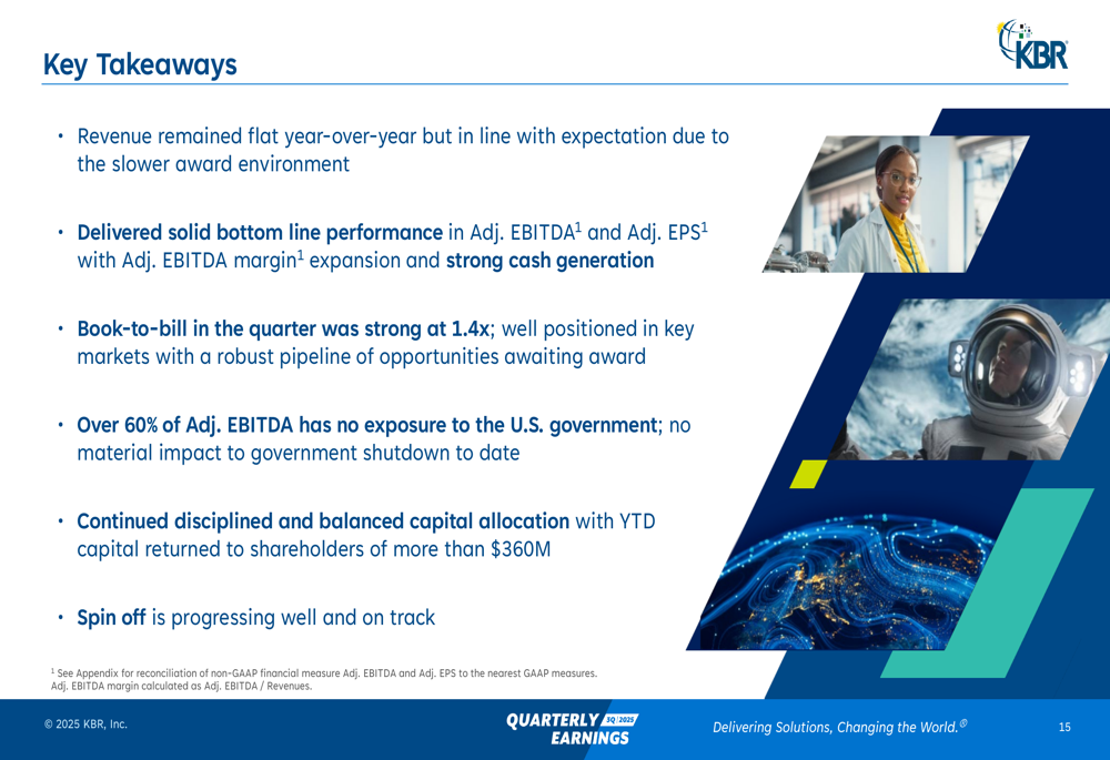 Despite the challenging revenue environment, KBR delivered solid financial performance in Q3 2025, with strong bottom-line growth and cash generation. The company’s diversified portfolio, with over 60% of adjusted EBITDA having no exposure to the U.S. government, provides some resilience against federal budget uncertainties.