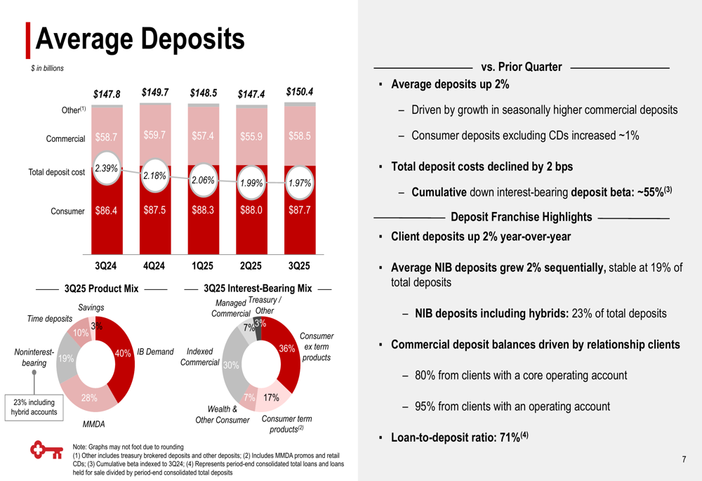 On the deposit front, KeyCorp reported a 2% year-over-year increase in average deposits, driven by seasonally higher commercial deposits. Consumer deposits excluding CDs increased by approximately 1%. The bank’s deposit costs declined by 2 basis points, with a cumulative down interest-bearing deposit beta of approximately 55%.