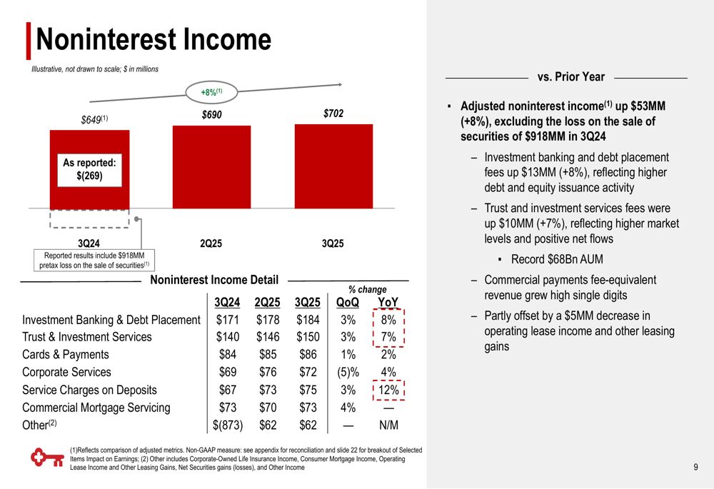 Noninterest income grew by 8% year-over-year to $702 million, excluding the loss on sale of securities of $918 million in Q3 2024. This growth was driven by strong performance across multiple fee-based businesses, with investment banking and debt placement fees increasing by 8% and trust and investment services revenue growing by 7%.